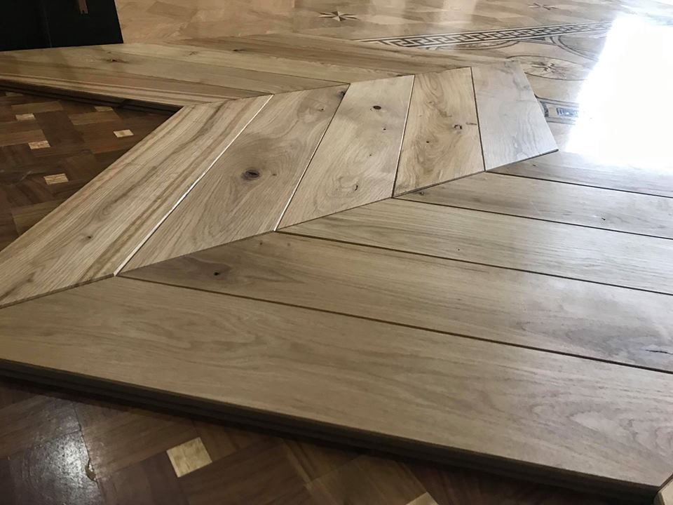 მასიური მუხა , ფრანგული წყობა, რუსტიკის კლასი. ზომა 700*120*18მმ